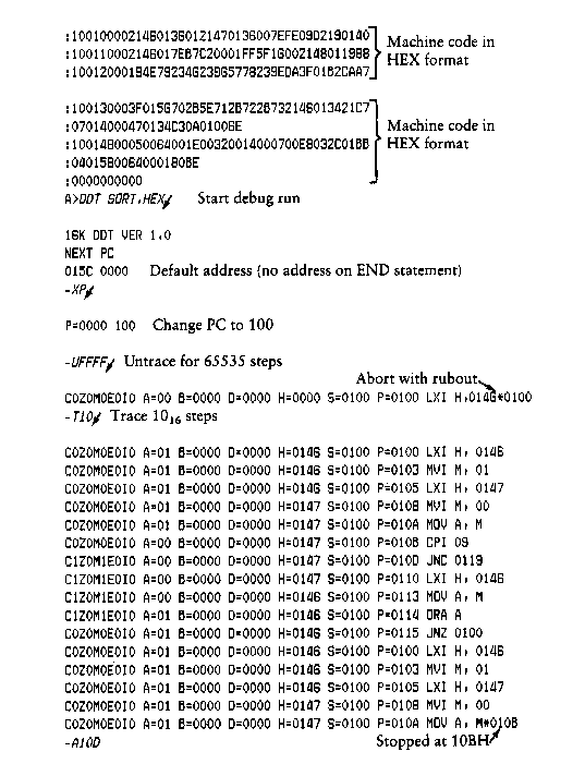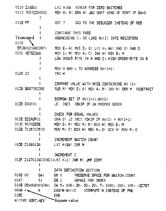 indicates that the source file is to be taken from disk A, the hex file is to be placed on disk B, and the listing file is to be sent to the console. The command